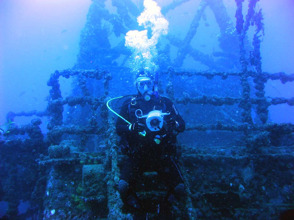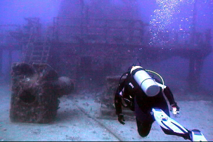 in 120 feet of water. It landed upright on a sandy bottom where it remains today with much of the super structure